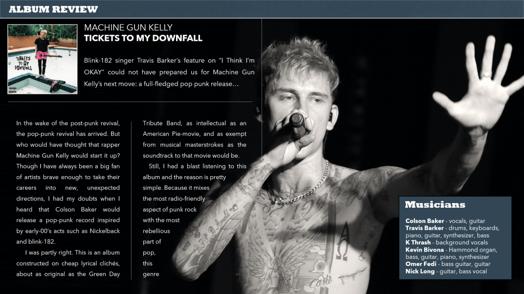 When Blink-182’s singer Travis Barker featured on “I Think I’m OKAY” on 2019’s Hotel Diablo, it was an early sign that the next move in the rapper’s career would be to approach the pop-punk genre, forgotten by everyone apart from Green Day. Now, it is back on the top spot of the Billboard charts and in the wake of the post-punk revival, we can start talking about a pop punk-revival. But is a rapper such as Machine Gun Kelly the right person to do the movement justice? Douglas Dahlström finds out below.